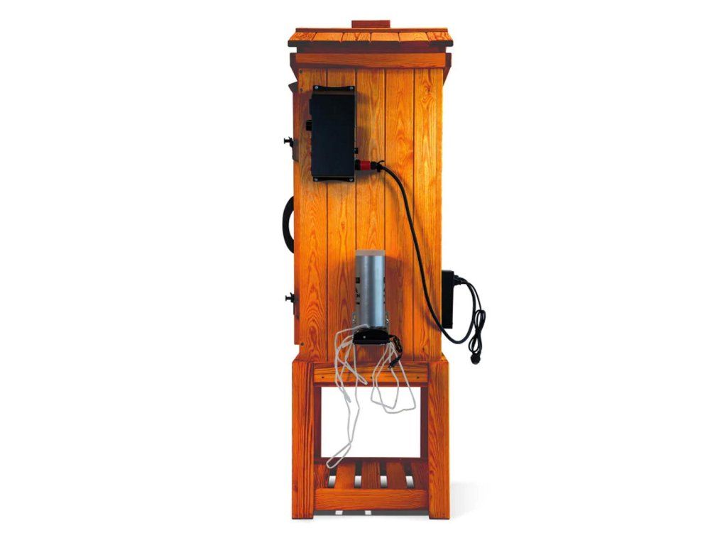 Elektrická dřevěná udírna Jelux o objemu 220 litrů je praktickým řešením pro všechny, kdo chtějí pohodlně připravovat domácí uzené maso, ryby, sýry, klobásy i další speciality. Konstrukce z masivního borovicového dřeva v elegantním dekoru ořech spojuje tradiční vzhled s moderním elektrickým systémem, který umožňuje stabilní a plně kontrolovaný proces uzení.