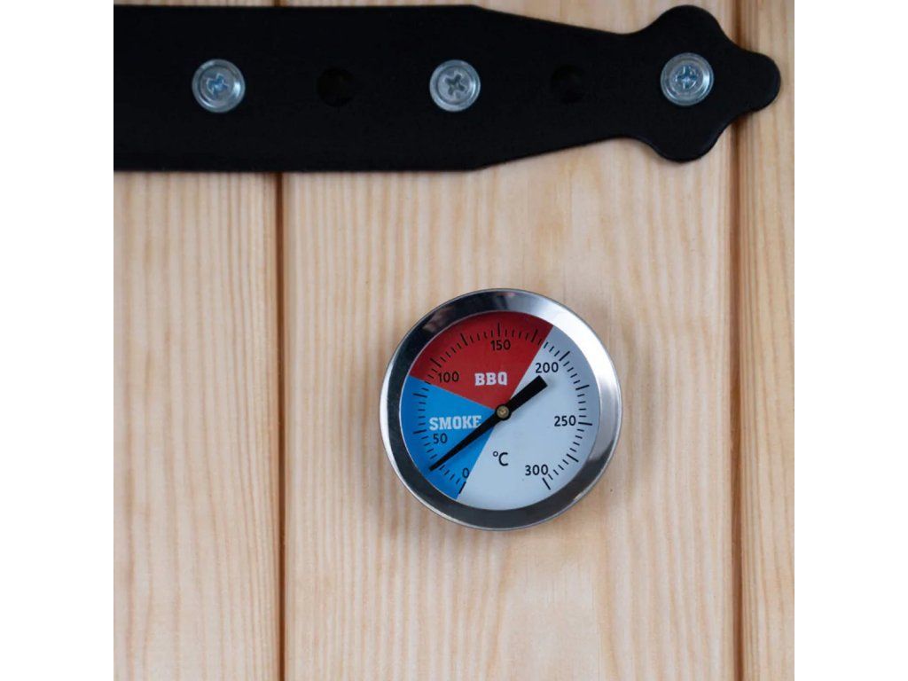 Udírna je vyrobena z přírodního borovicového dřeva, které je impregnováno v dekorativním odstínu borovice. Silnější dřevěné desky pomáhají lépe udržovat teplotu uvnitř komory a přispívají ke stabilnějším podmínkám při uzení. Celkový vzhled působí tradičně a elegantně, takže se udírna dobře hodí na zahradu, dvůr i chalupu.