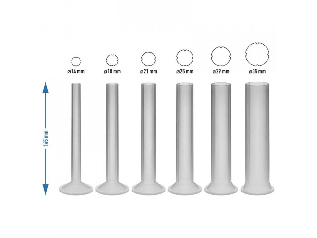 6 trychtýřů o délce 165 mm a různých průměrech: 14, 18, 21, 25, 29, 35 mm