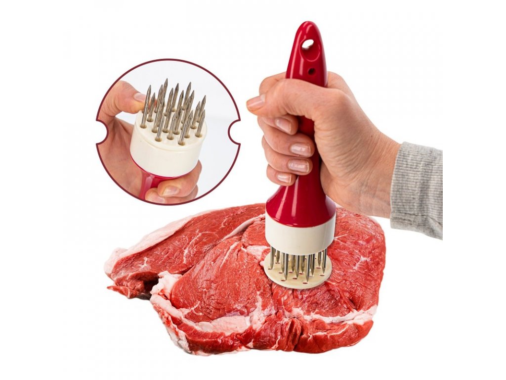 Milujete dokonale připravené šťavnaté steaky? Chcete, aby vaše vařená, pečená a grilovaná masa byla křehká a delikátní a jejich chuť zvýrazněna použitým kořením a marinádami? Vyberte si náš tenderizér na maso - nenahraditelné zařízení v kuchyni i při přípravě grilovaných pokrmů. Použití tenderizéru je extrémně jednoduché a zároveň bezpečné. Kovové čepele o délce 2,8 cm ukryté v plastovém pouzdře se vysouvají z přístroje pouze při přitlačení k masu. Díky tomu se nemusíte bát nechtěného zranění! Proč se doporučuje maso propichovat? Zaprvé – tento postup umožňuje zkrátit vaření, smažení a grilování až o 50 %! Za druhé - umožňuje lepší vstřebávání marinád a koření. Vláknité maso změkne a pokrmy budou křehčí a šťavnatější. Propíchnutí masa také zabrání tomu, aby se celý pokrm při pečení srazil!
