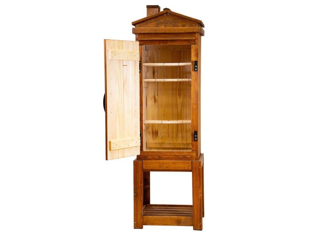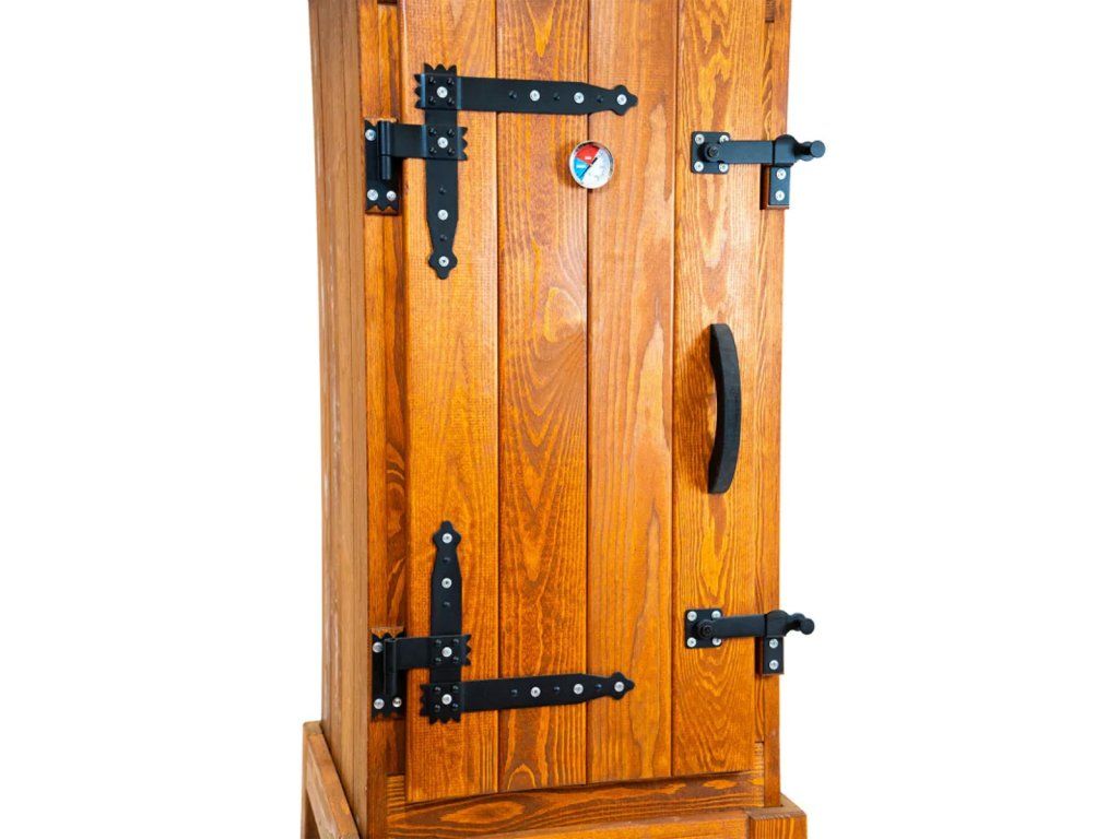 Tato dřevěná udírna kombinuje tradiční vzhled, solidní zpracování a praktickou výbavu pro pohodlné domácí uzení.