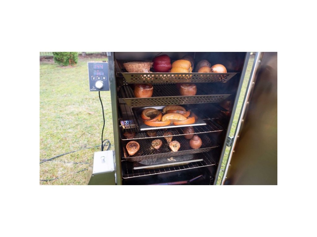 VYROBENO Z NEREZOVÉ OCELI: Honovaná nerezová konstrukce a hustá perforace zajišťují rovnoměrné pronikání kouře a teploty pro efektivní uzení.